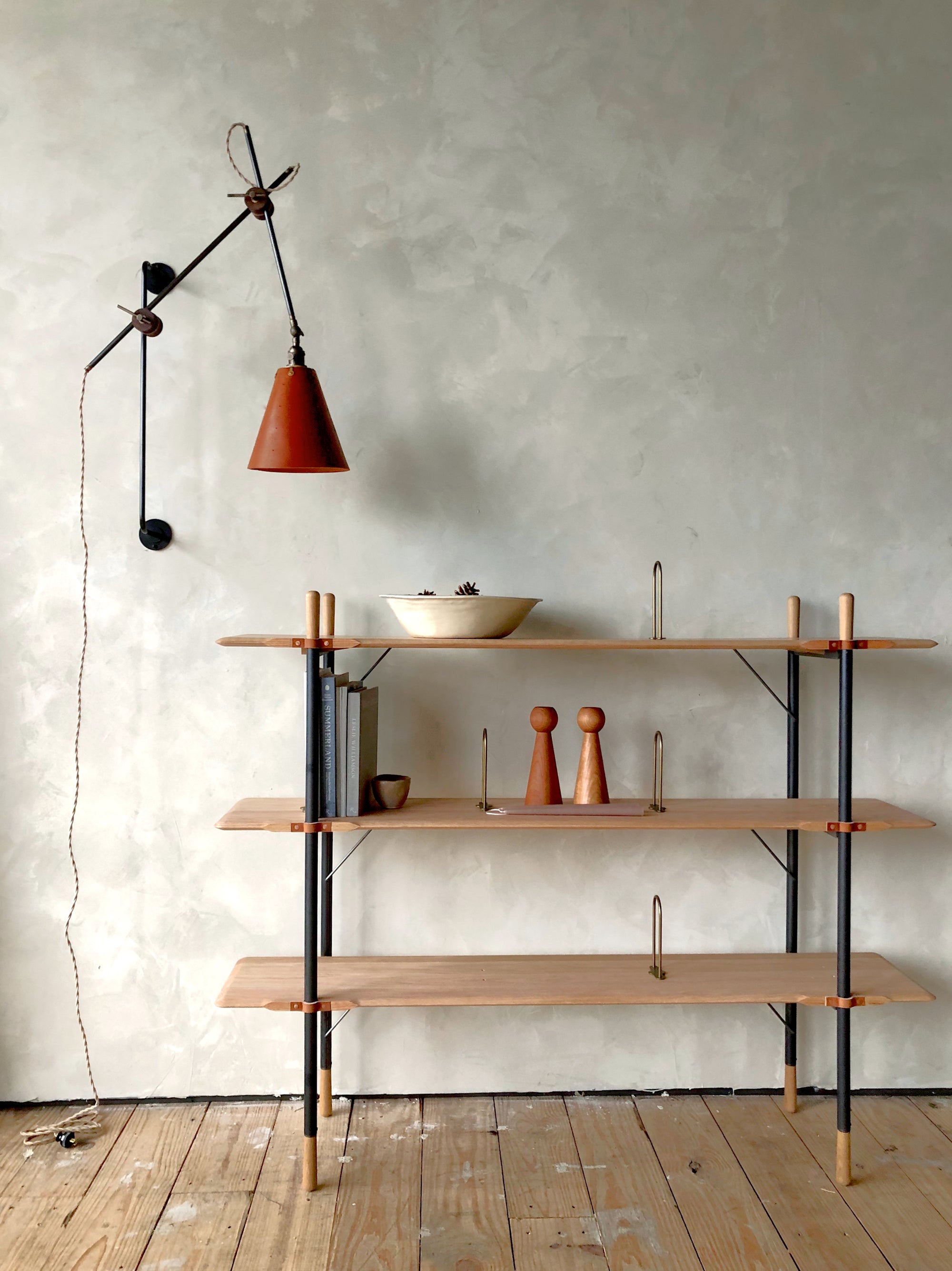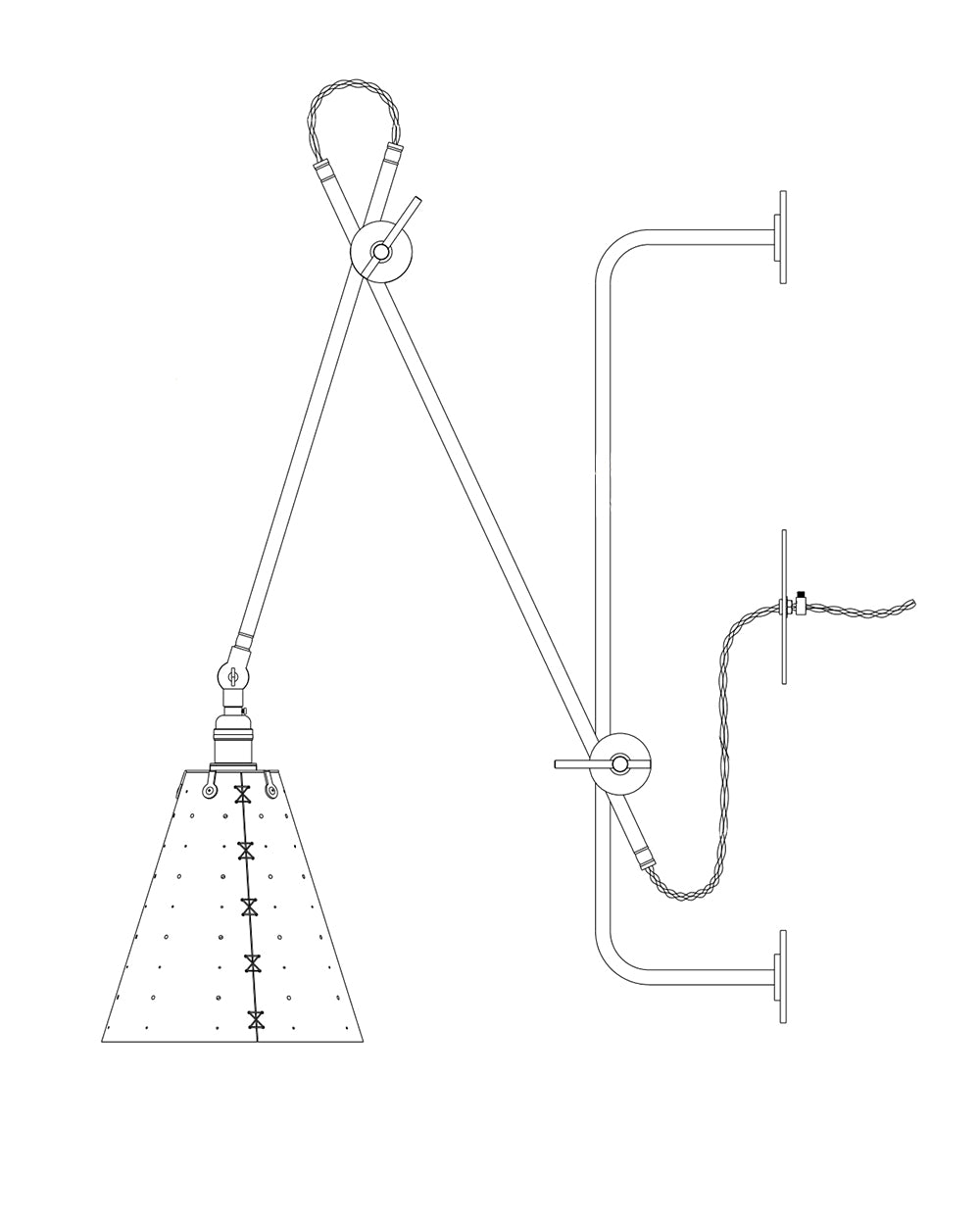 Celebrated for its striking composition and versatility, the Grace Articulating Wall Sconce is a true hallmark of ingenuity in lighting design. As handsome as it is useful, this hardwired wall sconce connects two lengths of steel piping with a black walnut joint that can easily be loosened for articulation and locked into place with a brass bar. A second joint connects the fixture to a wall-mounted steel bar allowing it to slide up and down. To create a complete range of motion, simply pivot the shade in all directions as a spotlight. Small perforations in the hand-stitched leather shade soften the presentation. Use as a desk lamp over a drafting table, as a bedside light, or simply mount adjacent to your favorite leather club chair. Made in the USA by Robert True Ogden for Lostine. Available with a Black or Tan Harness leather shade.