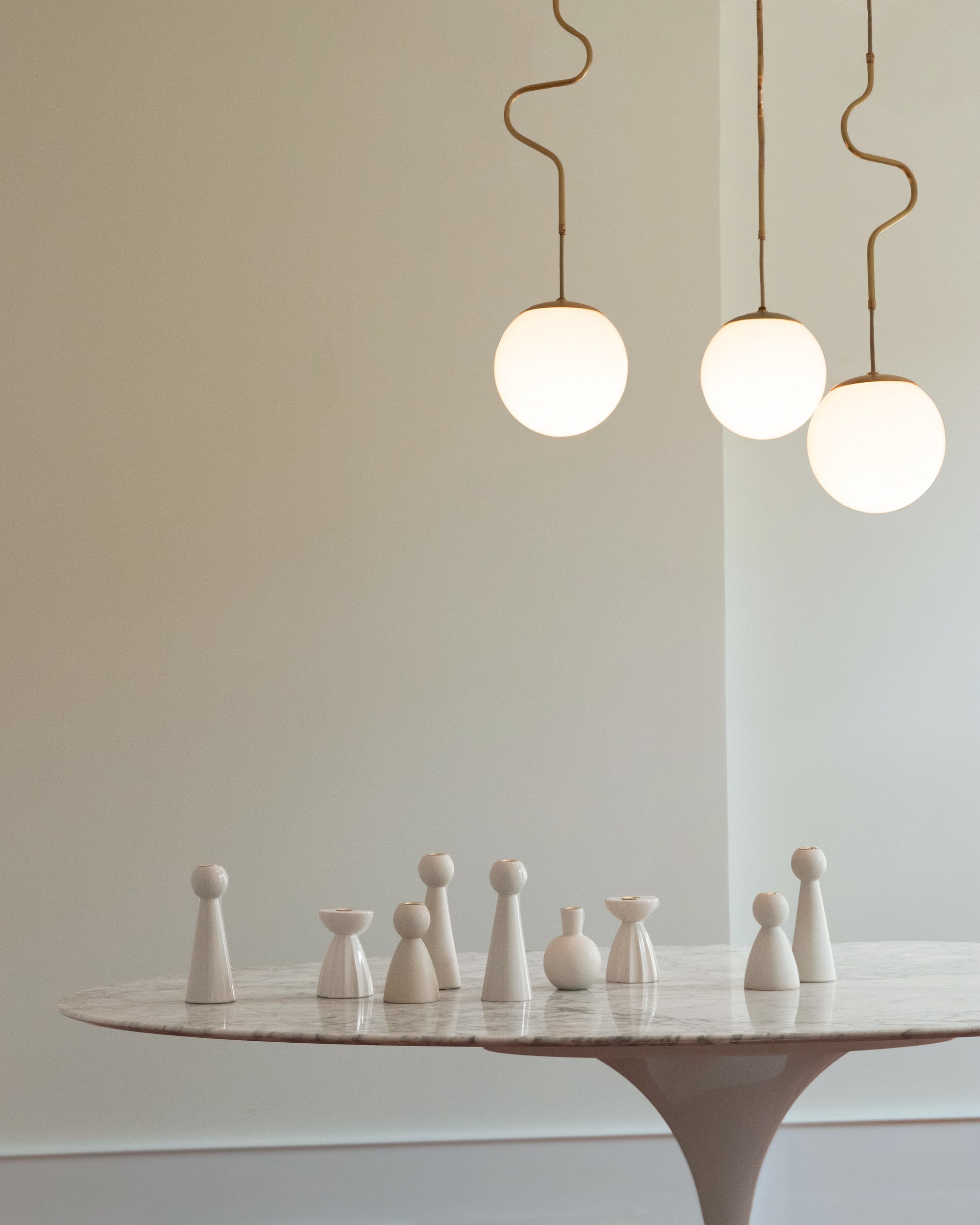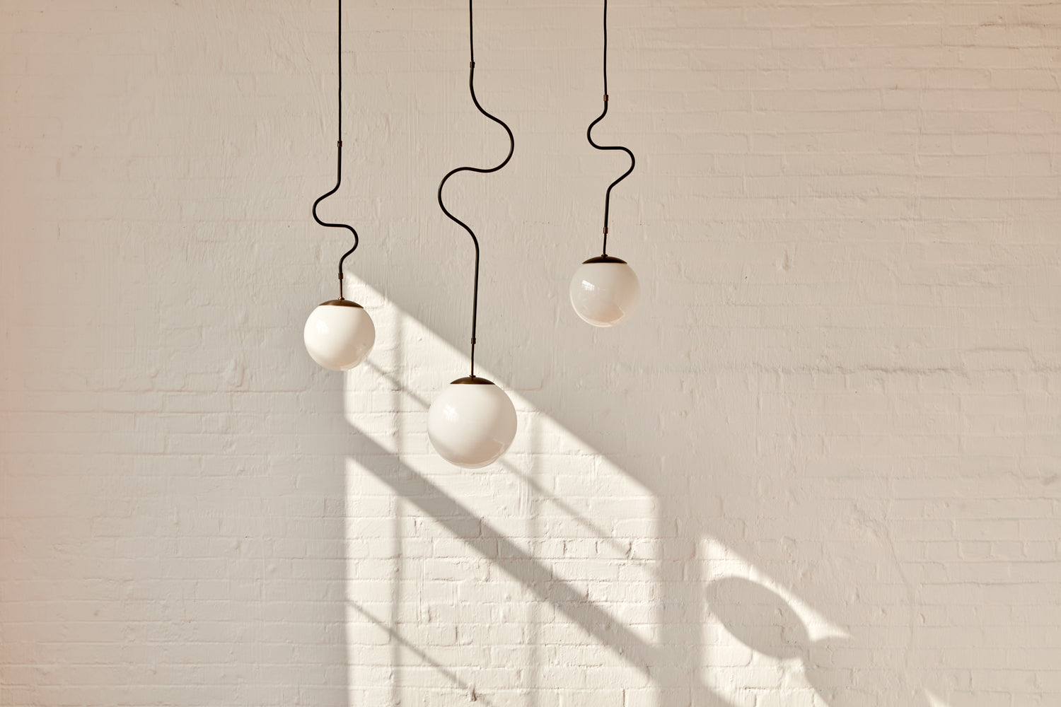 Inspired by the croquis and contour drawings of our creative director, the Lawrence Pendants evoke elegant simplicity with a refined sense of play. Made by hand in our Philadelphia studio, the Lawrence Pendant is engineered from brass that has been patinaed by hand with an oil rubbed brass finish, and connects to a white glass globe that glows with a subtle, old world beauty. Hang one as a solo ornament, or group them together for an exploration of form, space and shape.