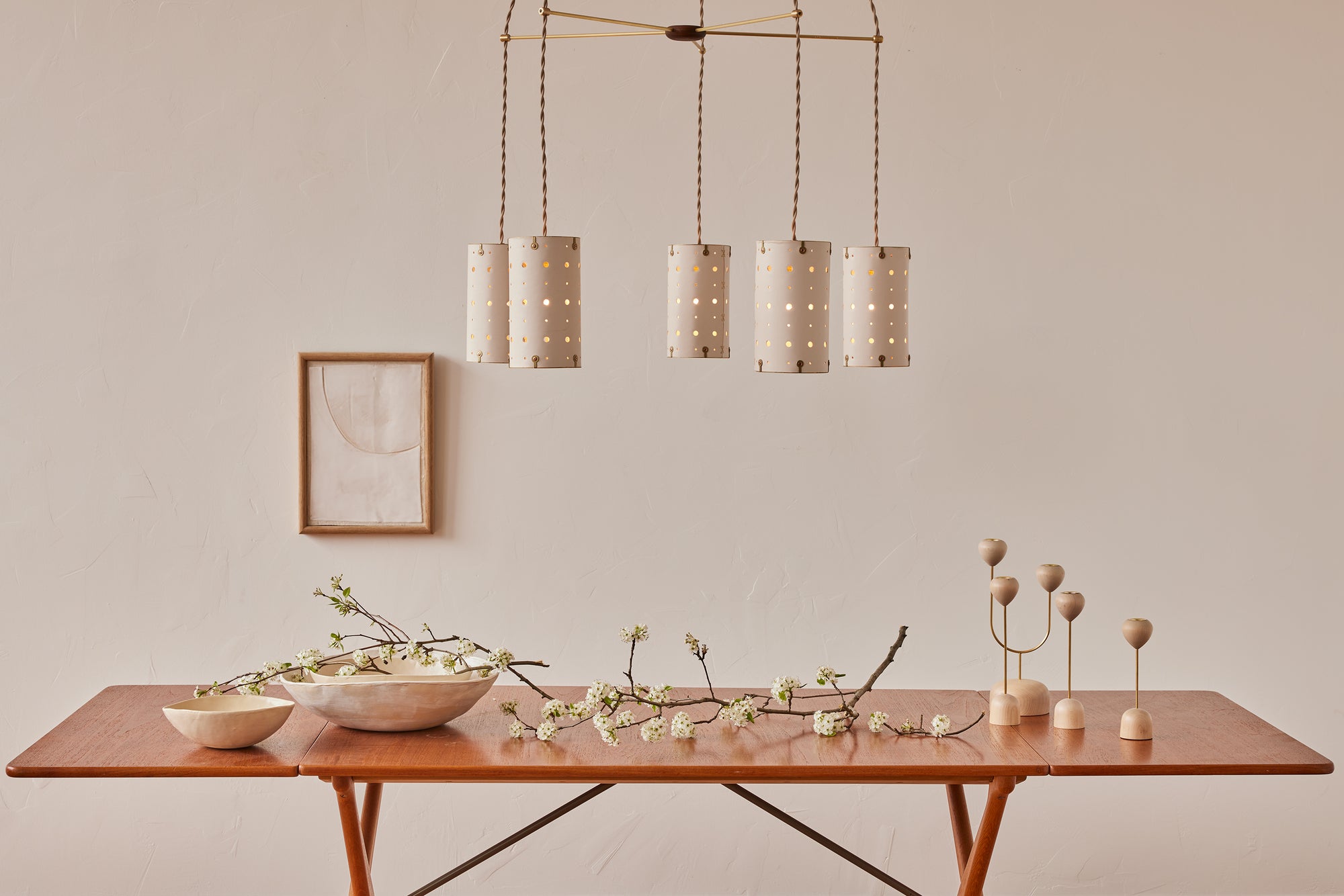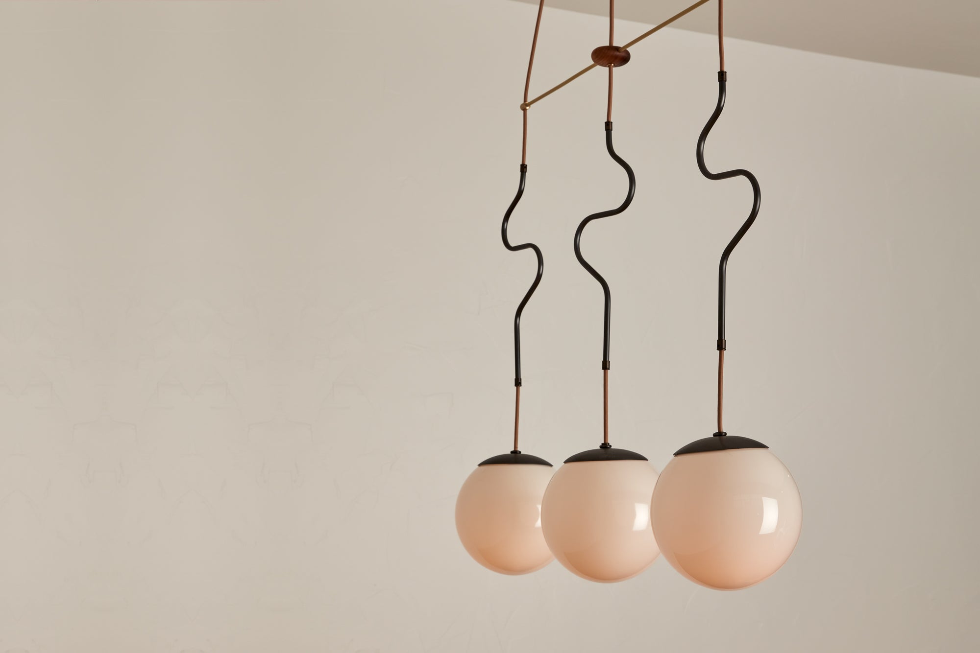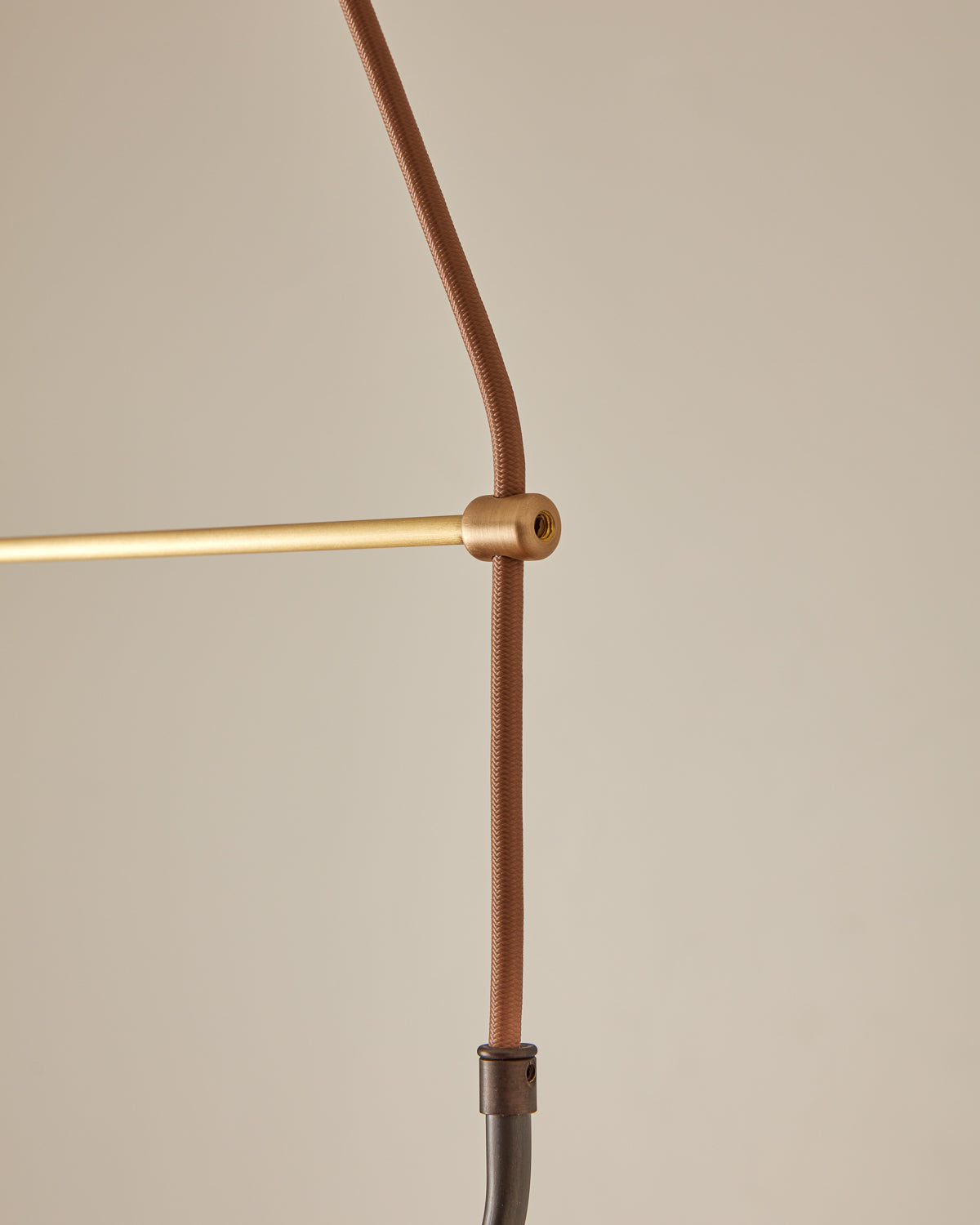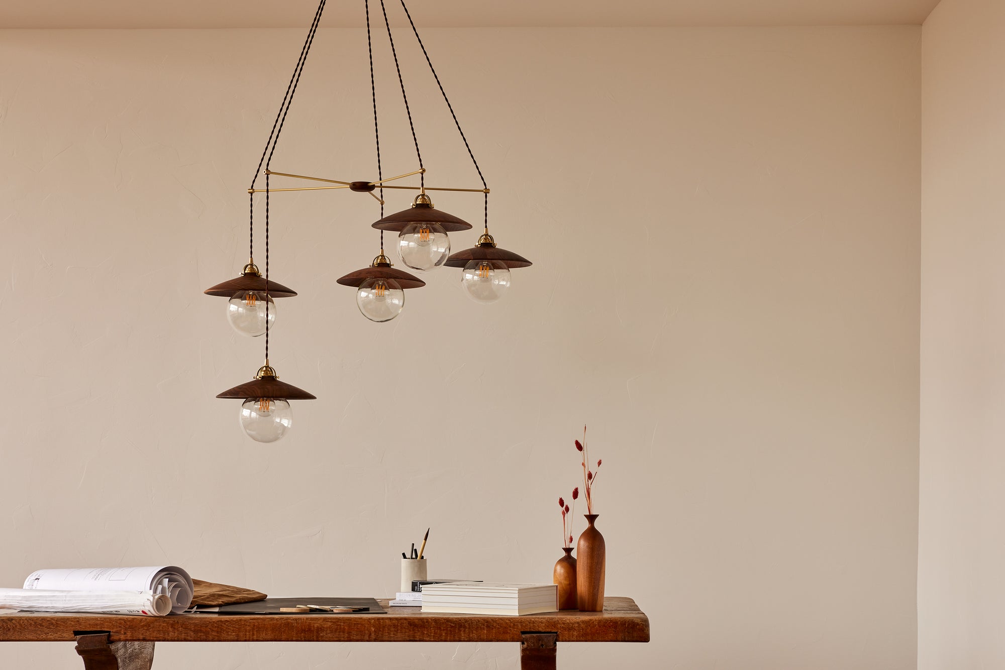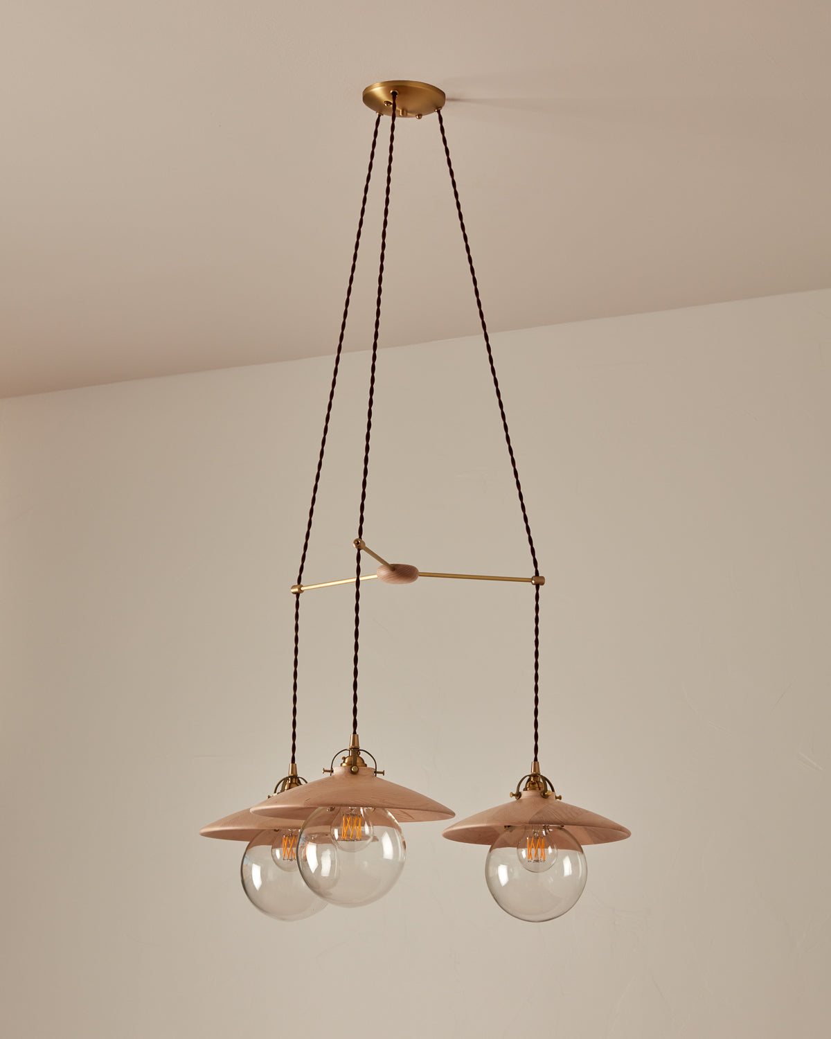 The framework includes a matching ceiling canopy, and the wooden puck at the center anchors the design of the brass framework. The brilliance of The Elsa System lies in its practical application, allowing multiple fixtures to hang from one electrical source, reducing the need for multiple junction boxes.