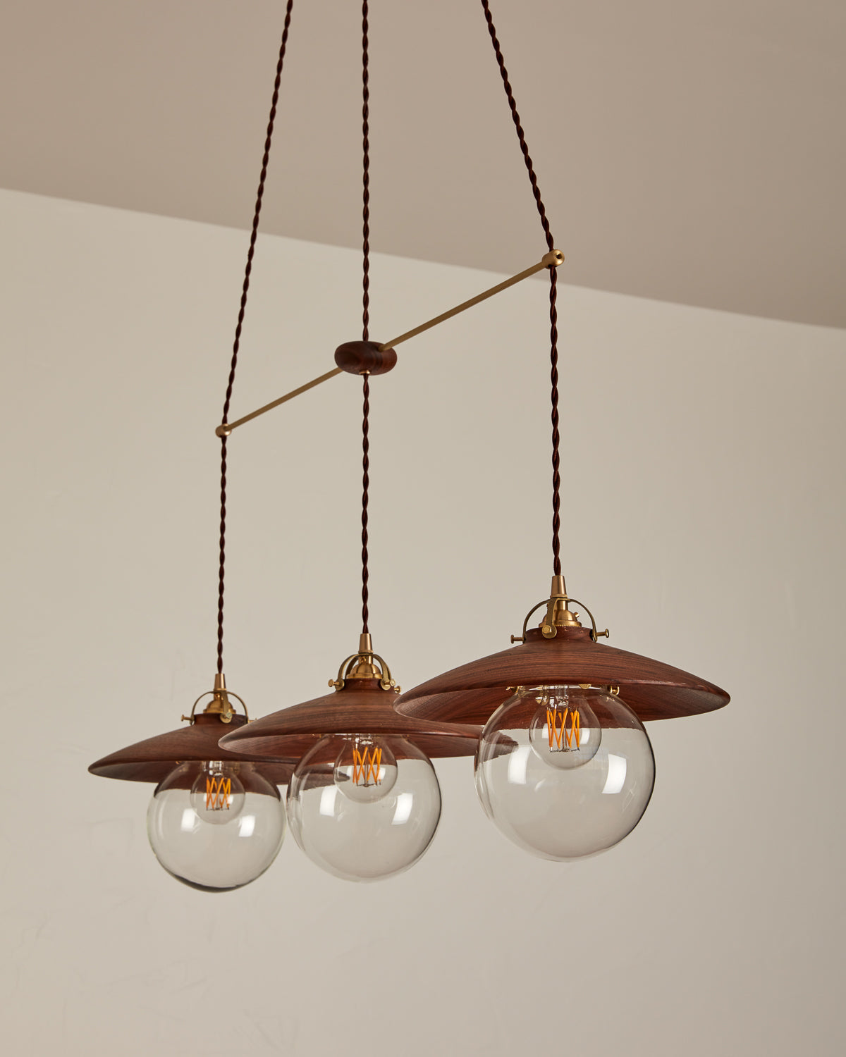 Lostine proudly offers our best-selling Elsa System + Pendant combinations, including the Three Pendant Straight in Satin Brass and Walnut with our Small Lawrence Pendant in Oil Rubbed Brass.