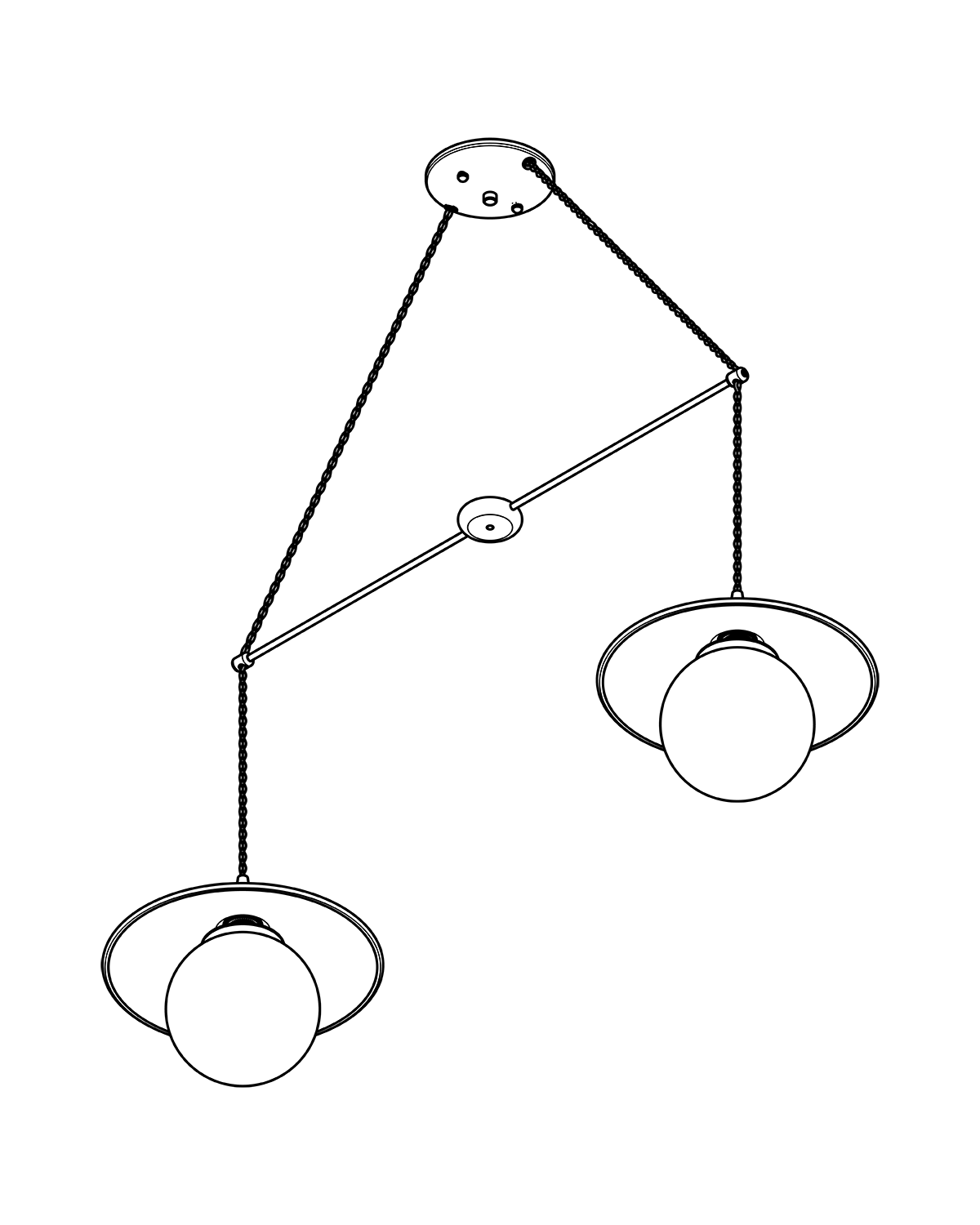 The framework includes a matching ceiling canopy, and the wooden puck at the center anchors the design of the brass framework. The brilliance of The Elsa System lies in its practical application, allowing multiple fixtures to hang from one electrical source, reducing the need for multiple junction boxes.